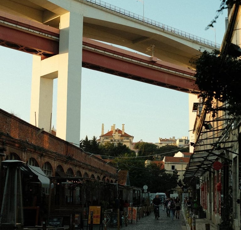 LX Factory is a vibrant cultural hub in Lisbon's Alcântara district, set within a former 19th-century textile factory. Transformed into a creative hotspot, it’s now home to eclectic shops, art studios, trendy restaurants, and co-working spaces, all nestled beneath the iconic 25 de Abril Bridge. Visitors can explore the famous Ler Devagar bookstore, admire stunning street art, and indulge in delicious food from local eateries. On Sundays, the LX Market brings handmade crafts, vintage finds, and artisanal goods to its lively streets. Easily accessible by tram, bus, or train.